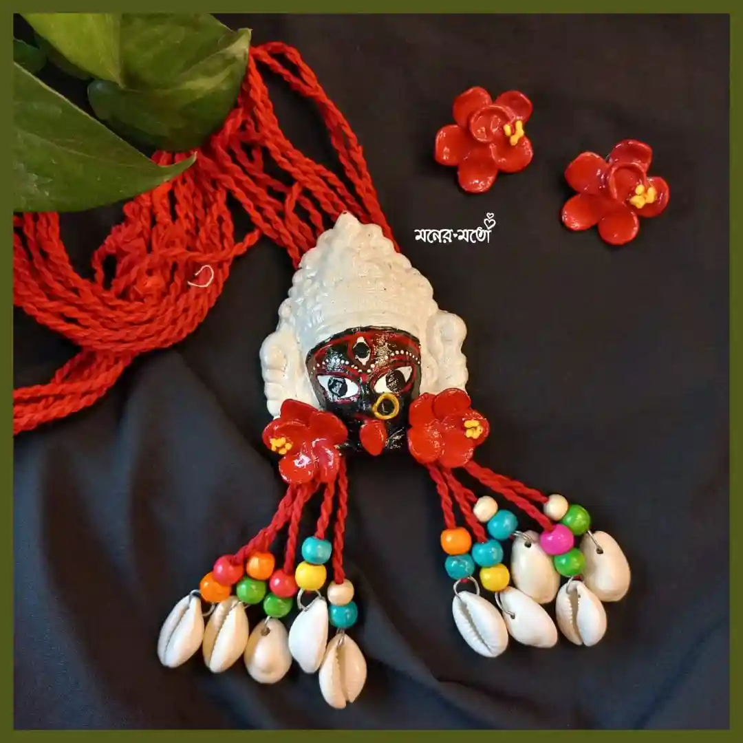 The Artistic Clay Maa Kali Necklace Set merges tribal craft with divine symbolism. The Goddess face pendant is detailed with hibiscus, shells, and vivid colours representing energy and victory over evil.
