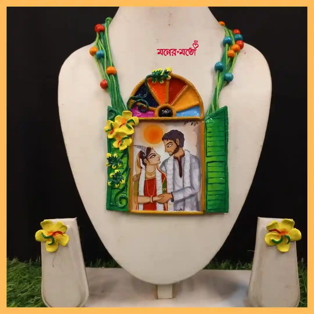 Celebrate love with Moner Moto’s Clay Couple Digital Paint Long Necklace Set, featuring a bride and groom gazing through a painted window of emotions.
