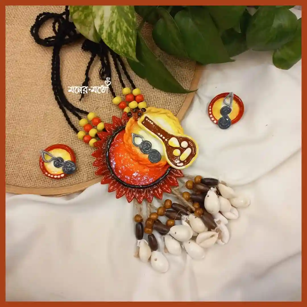 This artistic Clay Floral Beena Necklace Set draws inspiration from the Beena (Veena) — the sacred symbol of music, creativity, and Goddess Saraswati. The floral arrangement surrounding the instrument adds a soft, feminine charm, making it ideal for Saraswati Puja, cultural programs, and spring celebrations.