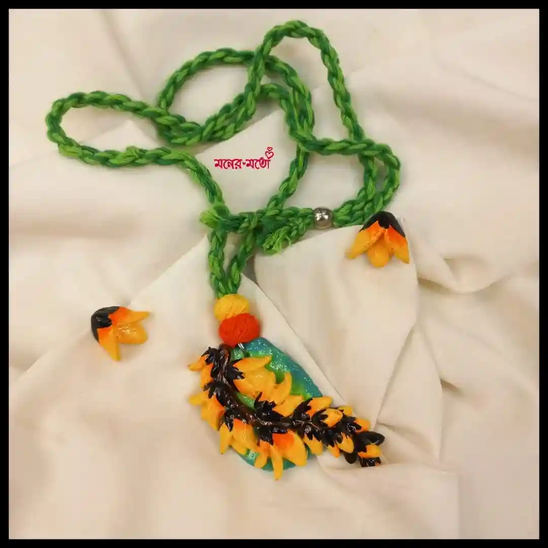 Designed specially for Saraswati Puja and traditional celebrations, this Clay Palash Necklace Set reflects the elegance of Bengali heritage. The vibrant Palash floral motifs are hand-moulded with fine detailing, making the set a perfect match for sarees, handloom outfits, and festive ethnic wear. Lightweight and comfortable, this necklace set beautifully blends devotion, culture, and artistic expression.