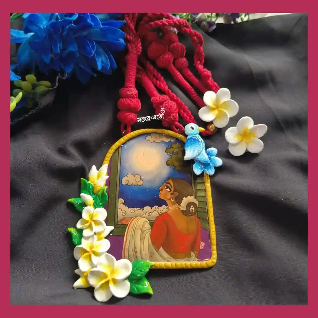 The pendant showcases a scenic artistic print, enhanced with handcrafted clay floral detailing and vibrant thread work. The combination of textures and colors gives it a bold yet elegant presence.