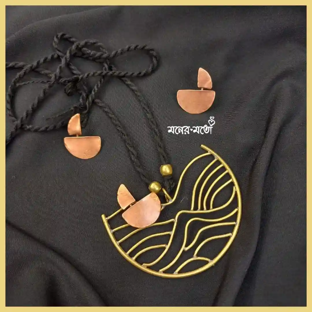 This Dokra Copper Necklace Set celebrates the raw beauty of ancient Indian tribal craftsmanship. The pendant showcases flowing wave-like linear patterns, inspired by nature and movement, crafted in traditional Dokra technique. Finished in a warm antique copper tone, the design feels minimal yet powerful—perfect for those who love statement jewellery rooted in heritage. The black thread tie-up keeps the look organic and comfortable, making it ideal for everyday ethnic styling or art-inspired fashion.
