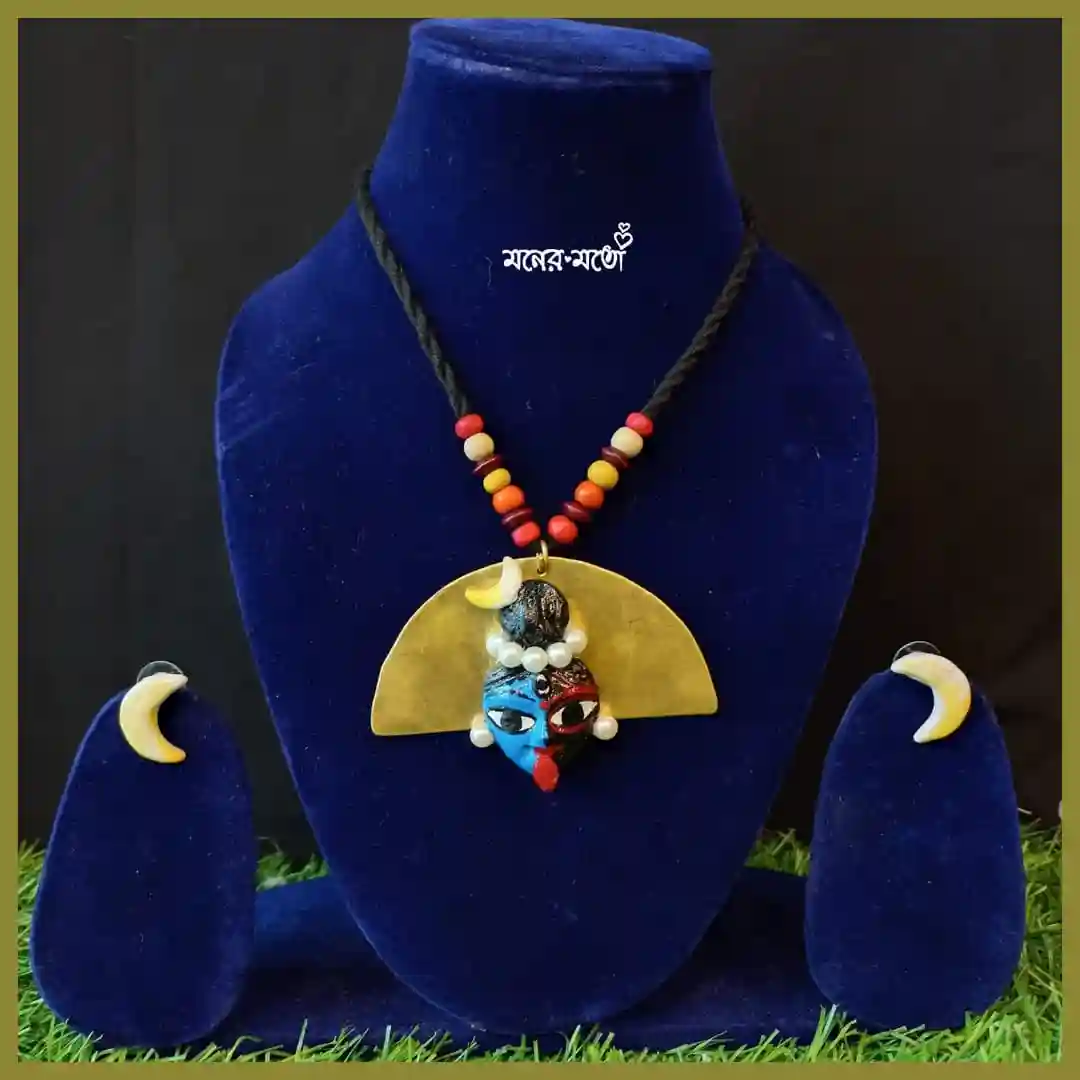 Celebrate the spirit of Shakti with this Maa Kali Dokra Clay Fusion Necklace Set. Crafted in polymer clay with hand-carved Dokra metal detailing, it depicts Maa Kali’s face surrounded by divine elements. The earthy texture and rich tones make it ideal for ethnic sarees during Kalipuja or festive evenings. Handcrafted with devotion by Moner Moto artisans.