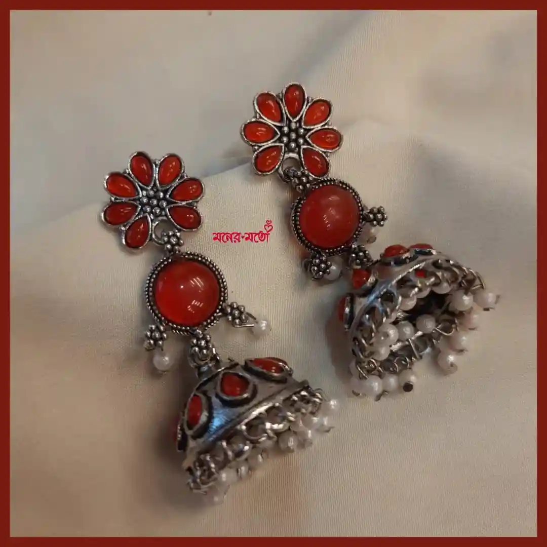 These elegant German Silver Floral Jhumka Earrings are a beautiful blend of traditional artistry and vibrant detailing. The upper portion features a blooming flower design formed with glass stones petals, symbolising freshness and joy. A round stone at the centre adds depth and balance, connecting gracefully to the classic dome-shaped jhumka below. The jhumka dome is adorned with embedded glass stone accents and finished with delicate white pearl hangings that move softly with every step. The oxidised German silver base enhances the antique charm of the earrings, making them a striking statement piece for ethnic and fusion wear.