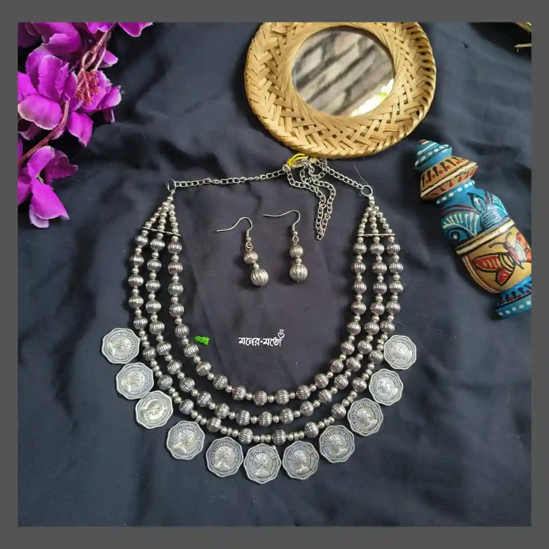 This German Silver Beads & Coin Necklace Set beautifully combines traditional charm with layered elegance. Designed with multiple strands of silver beads and finished with classic coin motifs, it reflects timeless ethnic artistry.