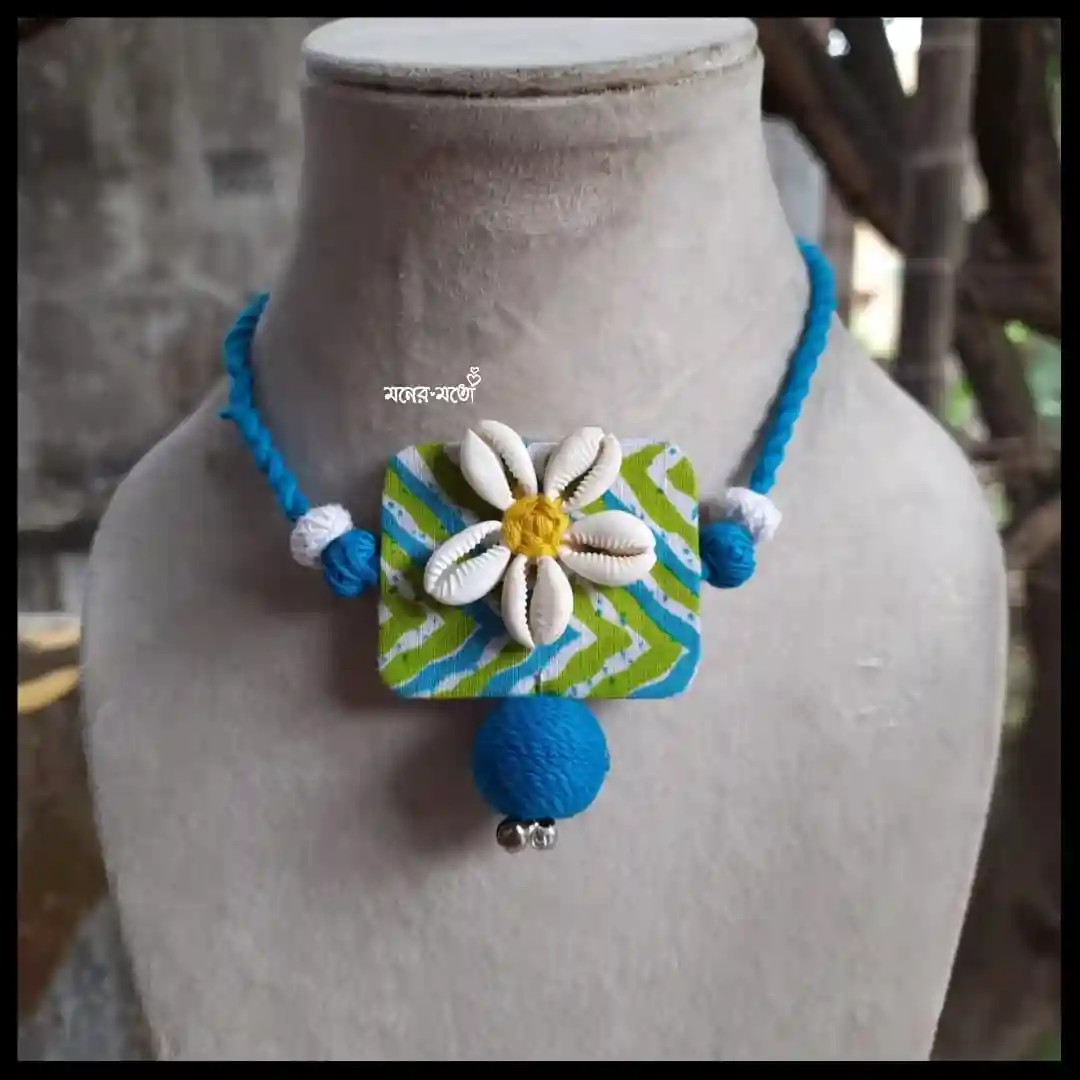 This Handmade Kori Necklace is brought to you by Moner Moto. Moner Moto is a well known brand across the fashion jewellery sector. We provide various types of classic and modern Necklace, Earrings, Finger Rings, Hair Accessories, Bags etc. Our product is a fully Handmade Necklace made of cotton Printed Fabric and Oxidised Charms, Thread Beads, Kori. Here we have tried to inherit Bengal’s great Art and Culture through our handmade or handcrafted jewellery set.