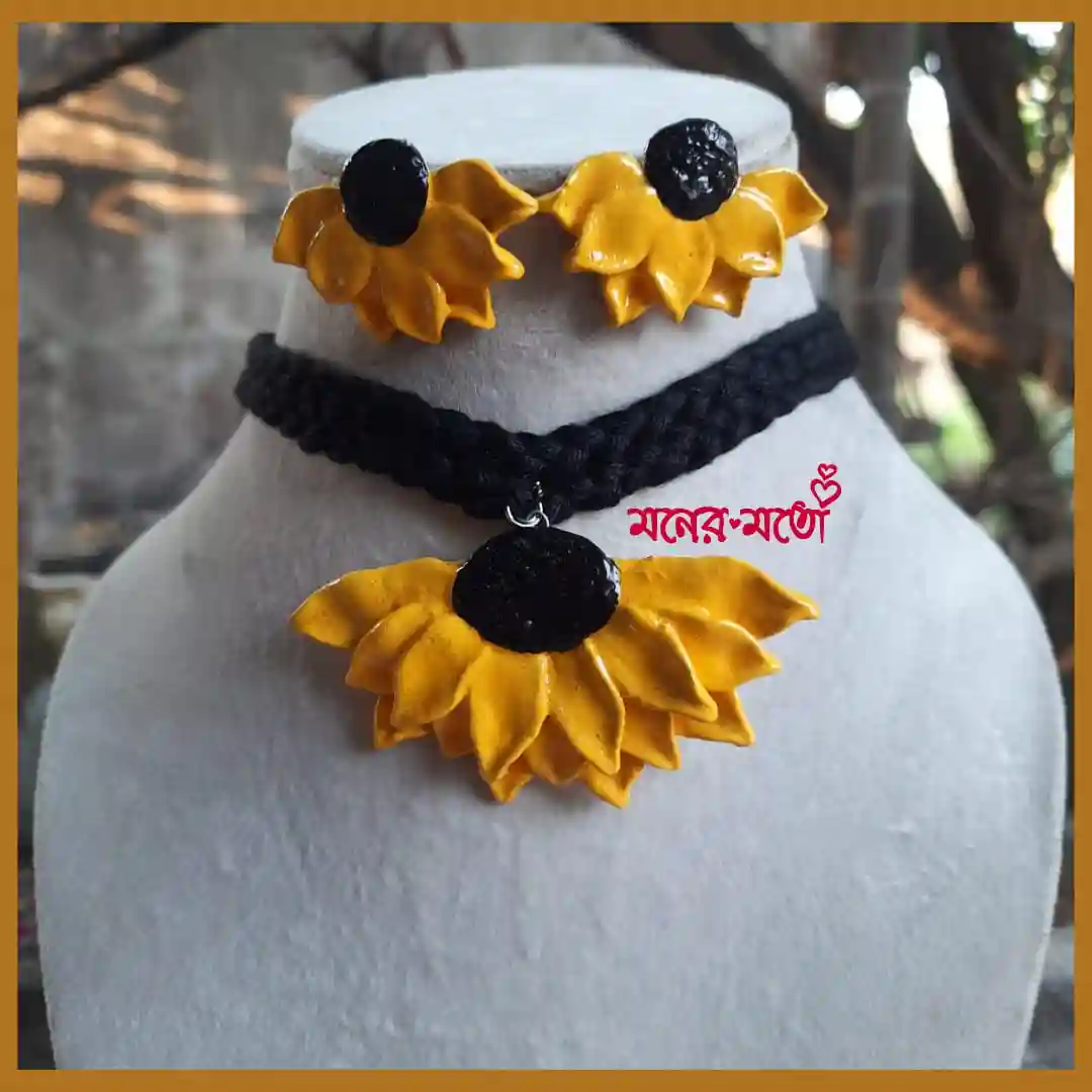 Moner Moto, which sets its tagline as “jewellery that touches your heart”, is a well known brand across the fashion jewellery sector. And Moner Moto gives true value for your money. This Terracotta Half Sunflower Necklace Set is brought by Moner Moto at your door step. We always try to provide the best quality handmade jewellery. Artistically crafted by hand, this Terracotta Half Sunflower Necklace Set, a Moner Moto Exclusive Customized Collection, is one to behold. Our Terracotta Half Sunflower Necklace Set is a beautiful and gorgeous “Mrittika” Collection, made of real fried clay or terracotta art, and is thus creating an awesome look. The Terracotta Half Sunflower Necklace Set thus captures modern art techniques well alongside the traditional values. Embrace your beauty and highlight your attractive appearance by wearing this Terracotta Half Sunflower Necklace Set which features a Sunflower motif design. It can be a perfect wear especially for “Basanta Utsav”