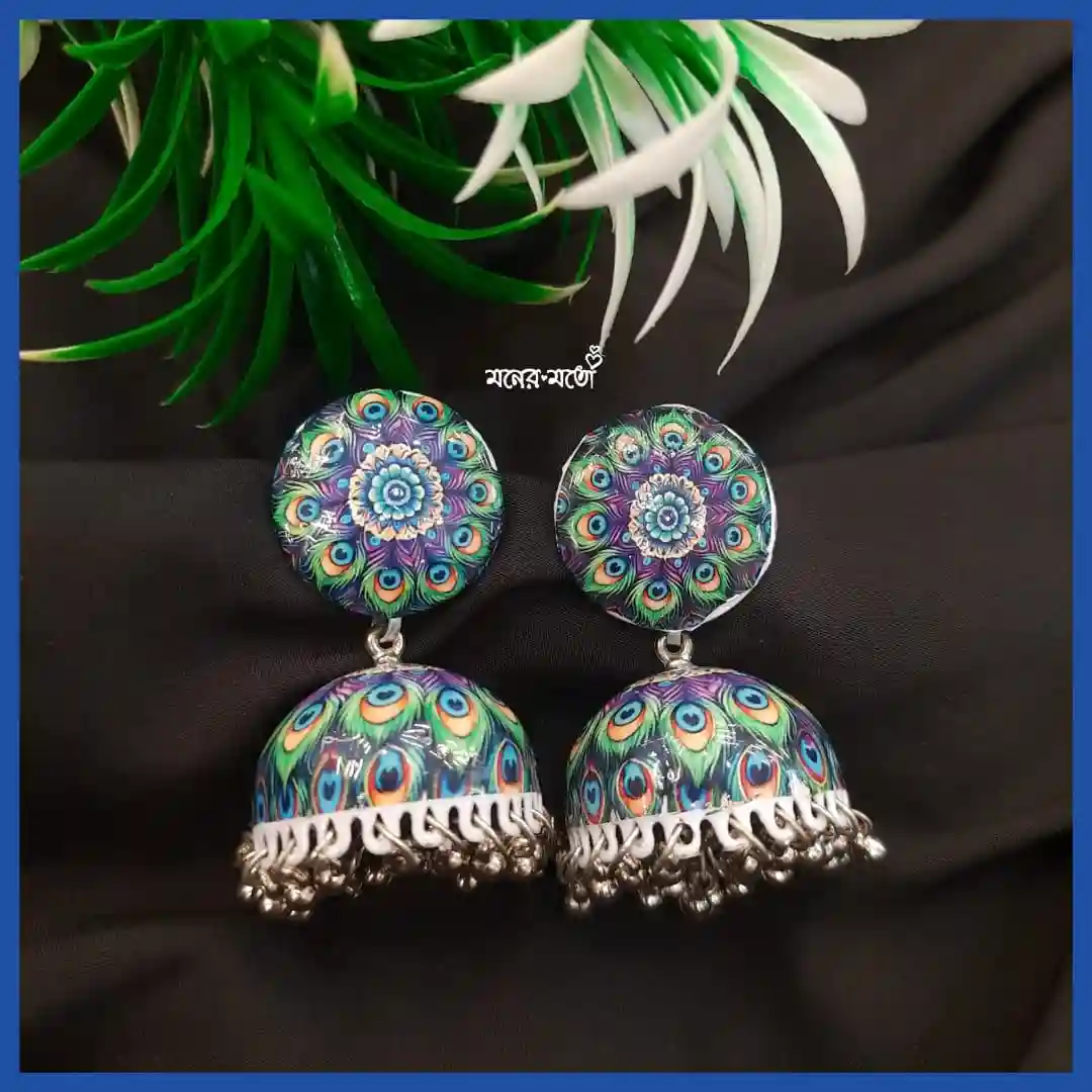 The Peacock Dream Digital Print Jhumka Earrings from Moner Moto bring a kaleidoscope of blue, green, and violet hues alive through digital artistry. Finished with silver ghungroo charms and traditional dome detailing, these earrings celebrate festive vibrancy in a fresh, fashionable way. Perfect for both ethnic sarees and Western silhouettes, this pair redefines Indo-Western fusion jewellery. Adorn your ears with the beauty of the peacock — India’s most majestic symbol of grace.
