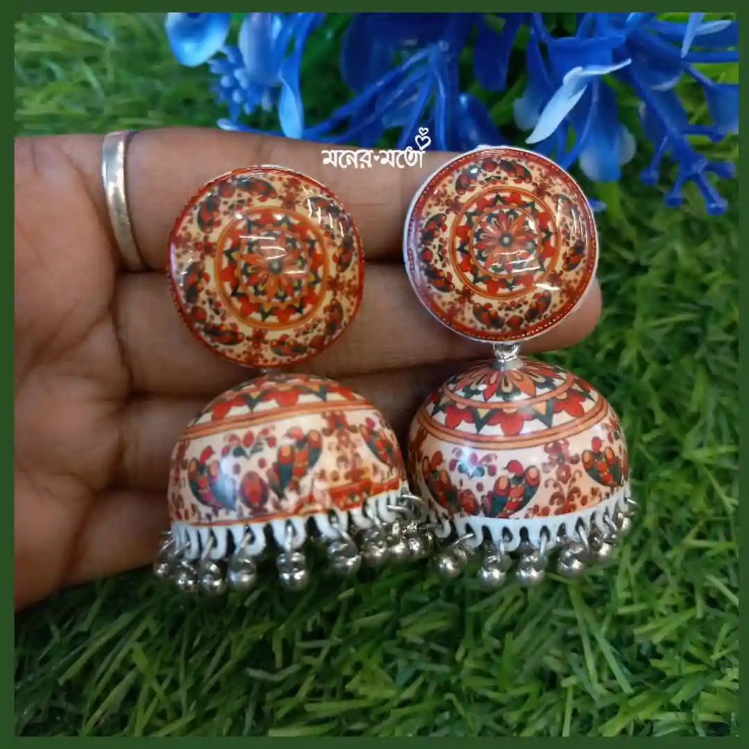 Celebrate festival season with these bold Vibrant Floral Print Jhumka Earrings. Each metal dome is digitally printed with detailed floral art, sealed with a glossy finish, and paired with a traditional jhumka silhouette. The delicate silver ghunghroo add a soft, musical jingle—lifting the piece from pretty to celebratory. Lightweight and durable, this pair is ideal for patchwork sarees, kurtis, lehengas, or relaxed Indo-Western fusion looks.